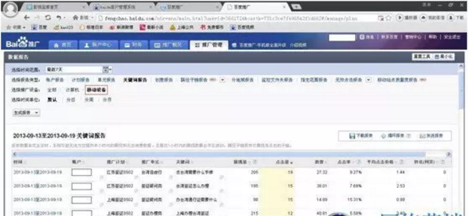 推广报表,百度统计中提供账户、计划、单元、关键词、搜索词等各个维度分设备的报告,第一时间评估无线流量价值。